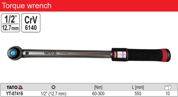 Thông số kỹ thuật của Cần siết cân lực 1/2″ 60–330Nm 550mm Yato YT-07415