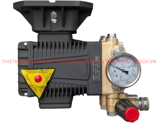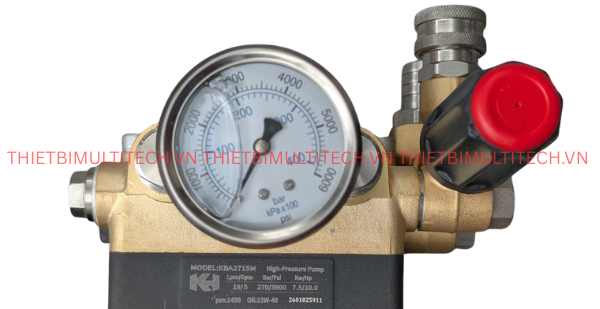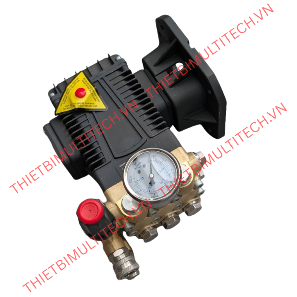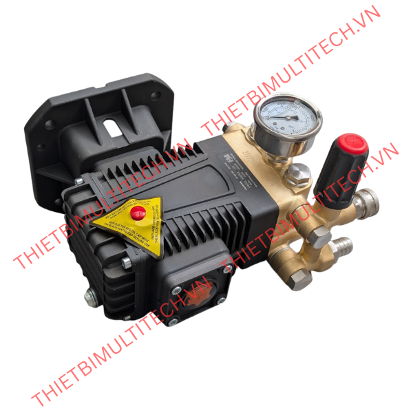 Đầu bơm đi kèm với cụm van chỉnh áp (Unloader Valve) chắc chắn và đồng hồ đo áp suất chính xác. Bạn có thể dễ dàng điều chỉnh áp lực từ 50 bar đến 250 bar để phù hợp với từng công việc (xịt gầm xe tải hoặc rửa xe máy).