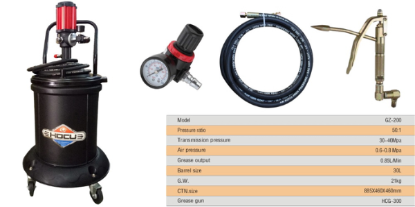 Máy bơm mỡ khí nén Kocu 30L GZ-200 hoạt động dựa trên nguyên tắc sử dụng khí nén để tạo áp lực đẩy mỡ từ thùng chứa ra ngoài.