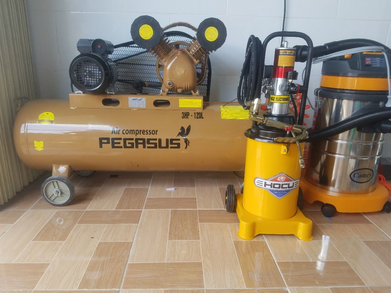 - Cắm dây khí nén vào máy nén khí và đầu vào khí của máy bơm mỡ.