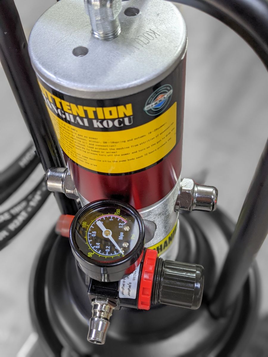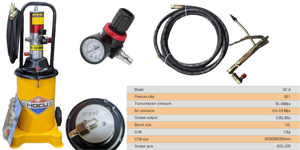 Máy bơm mỡ khí nén Kocu 12L GZ-8 hoạt động dựa trên nguyên tắc sử dụng khí nén để tạo áp lực đẩy mỡ từ thùng chứa ra ngoài.