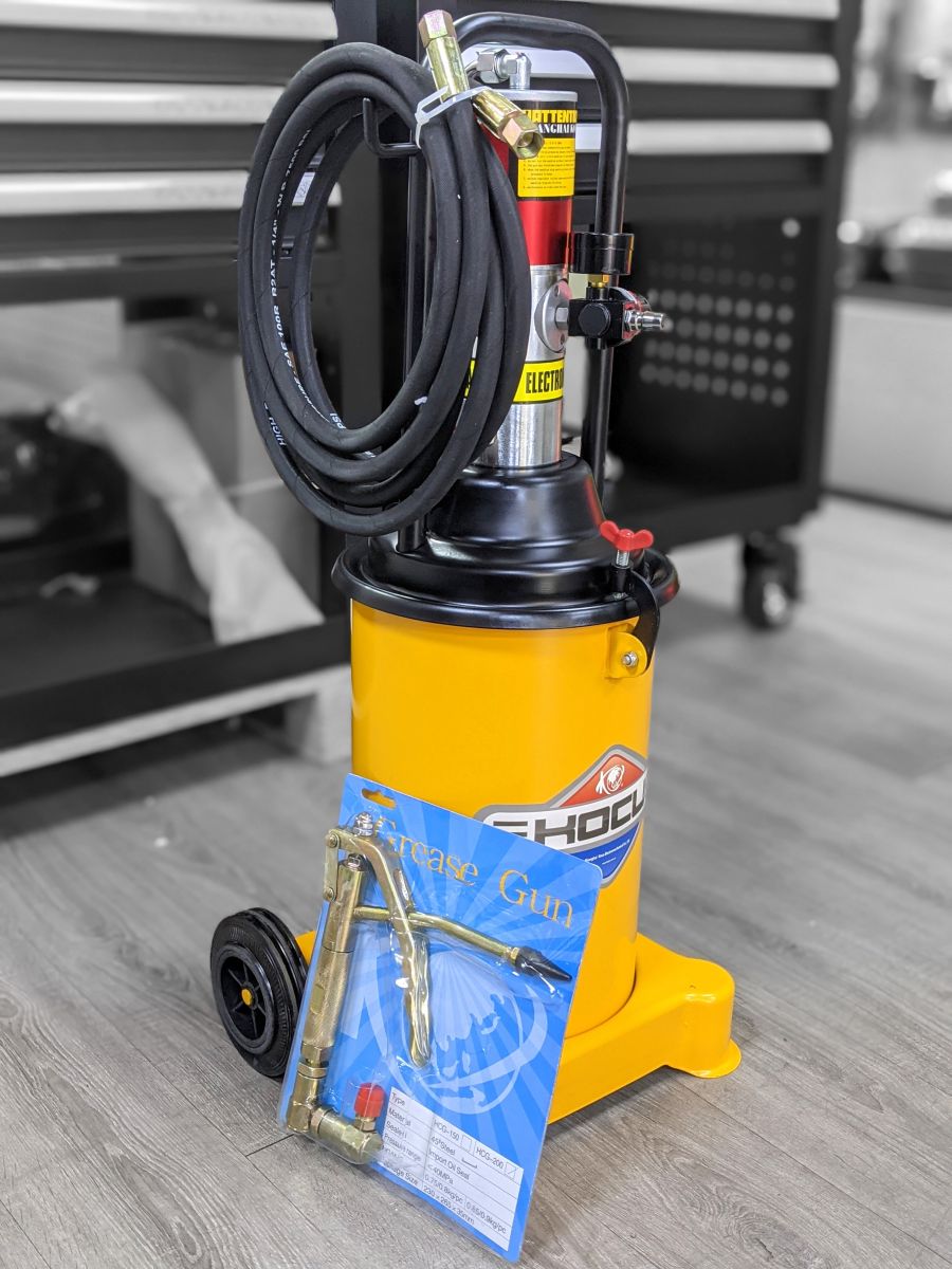 - Hiệu suất cao: Máy có dung tích bình chứa lớn 12 lít, cho phép bơm mỡ liên tục trong thời gian dài. Áp suất khí nén mạnh mẽ giúp đẩy mỡ vào các chi tiết máy một cách nhanh chóng và hiệu quả.